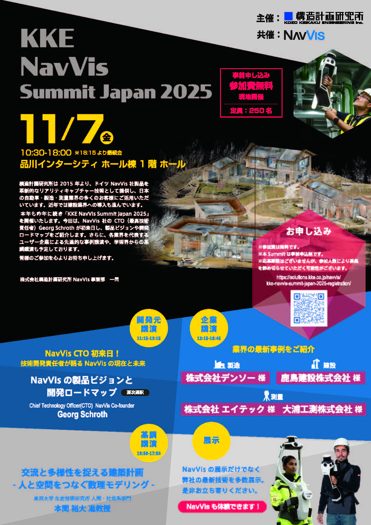 2015年よりドイツ・NavVis社のリアリティキャプチャー(屋内モバイル計測)ソリューションを提供している構造計画研究所様の主催で開催されているイベントです。日本の自動車・製造・測量に加え、建設分野でも広がるデジタルツイン活用の“今”を、一次情報でキャッチアップできます。