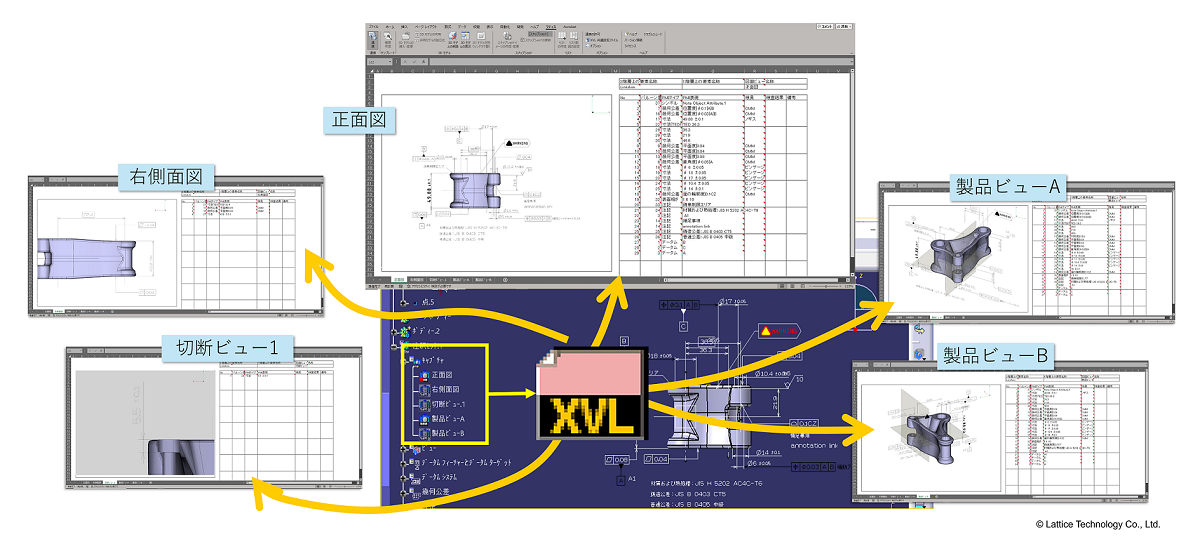 設計部門が出力した3D図面から帳票を作成しますが、設計が登録したビューは異なるビューで後工程では帳票作成するケースがあります。そこで、XVL Studioで後工程に必要なビューをスナップショットに保存、それを最新版のLattice3D Reporterを利用することでスナップショット毎に帳票シートを出力できます。これにより、効率的に帳票を作成できます。